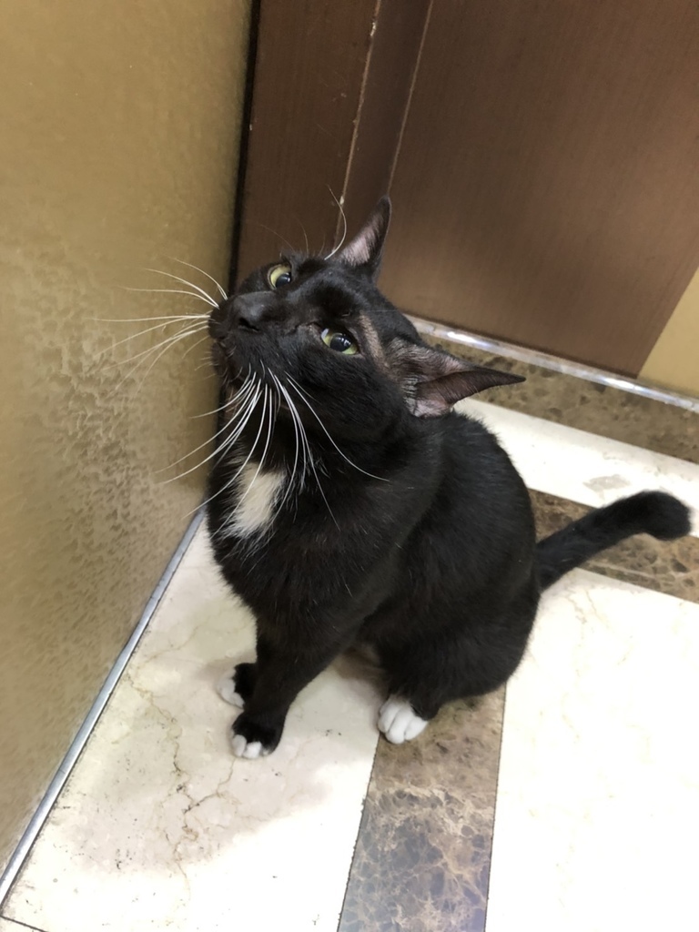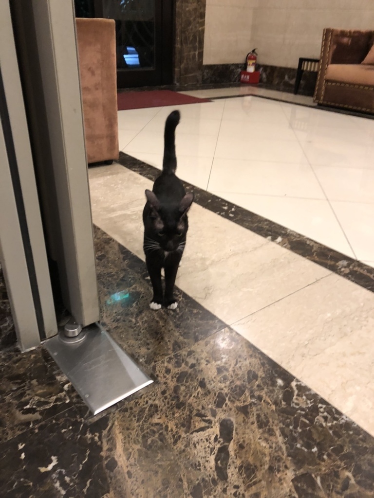 某天,我到一樓大廳拿包裹,要回到15樓的路上就遇到了牠,面對我們大樓的一樓大門,還坐得挺正,一副就是『我要上樓,怎麼還沒人開門』的樣子,因此我善意地邀請牠一同搭乘電梯,但當時我沒拍到照片,因此附上日後八荒問路提供的。